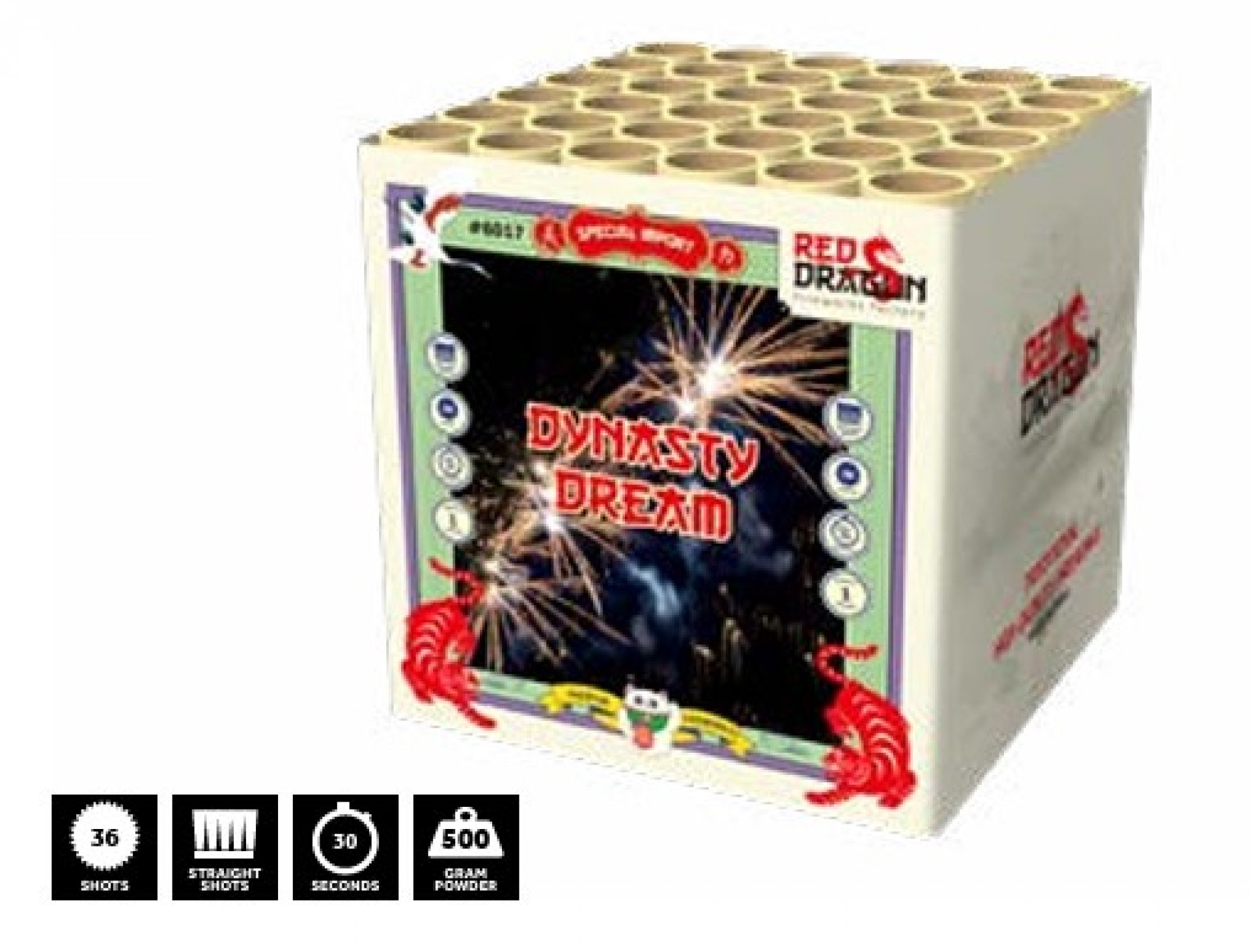 Je droomt bijna weg bij het kijken naar de Dynasty Dream. De cake bevat 36 schoten met een combinatie van blauwe, paarse, rode, groene en gouden effecten.