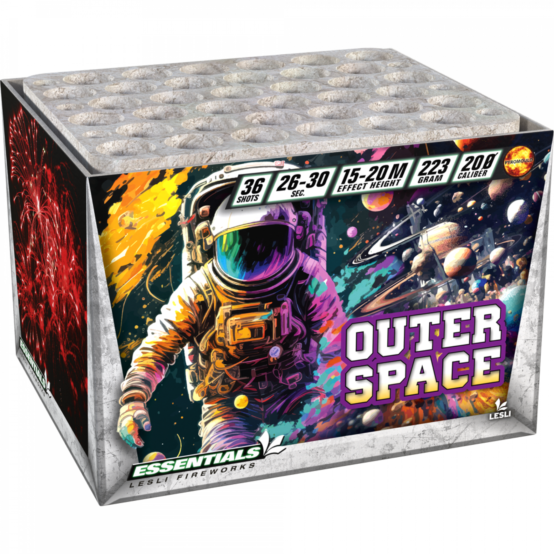 I’m gonna send you to Outer Space! Diepgouden effecten met bloedrode pearls & knalblauwe sterren in de finale! 36 schots Pyromould.
